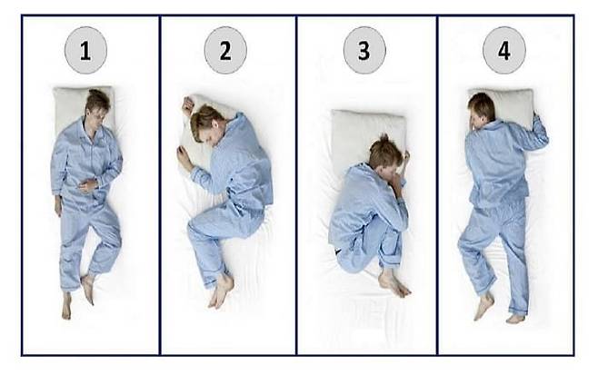 여기 서로 다른 수면 자세가 찍힌 사진이 있습니다. 반듯하게 누워서 잠든 자세에서부터 옆으로 누워서 자는 자세, 태아 자세로 자는 자세, 엎드려서 자는 자세가 있습니다.