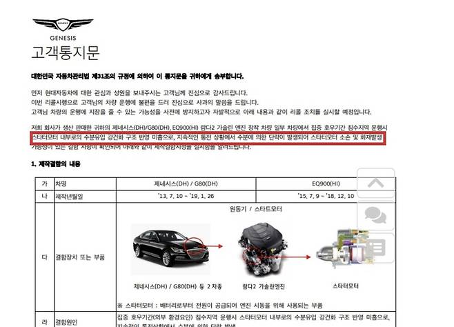 고객통지문 상 정확한 보상 내용은 ‘스타트모터 소손 및 화재발생 가능성이 확인되면, 자동차관리법 31조의2에 따라 자동차 시정 비용을 보상받을 수 있다’였다.
