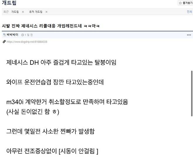온라인 커뮤니티 ‘개드립’에는 최근 제네시스DH 오너의 리콜 대응 경험에 대한 글이 올라왔다. “X발 진짜 제네시스 리콜 대응 XX 레전드네”라는 제목의 글이다.
