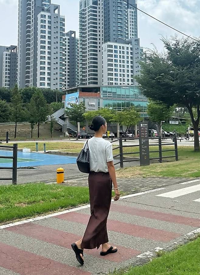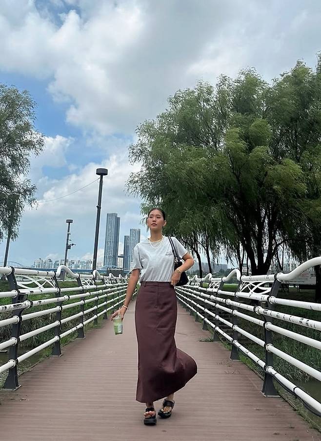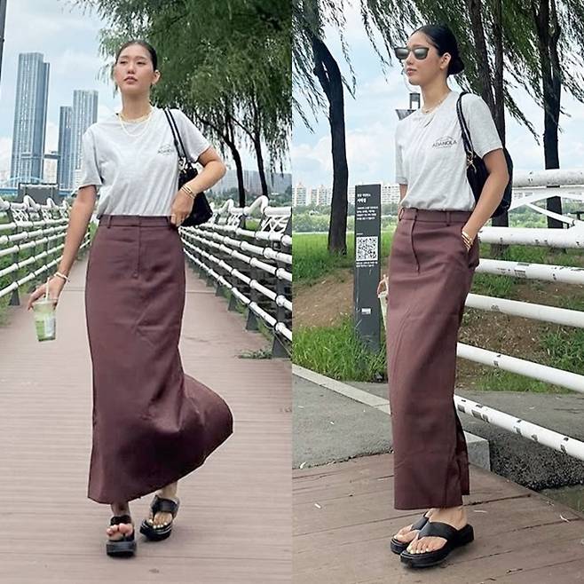 공개한 사진에서 미미는 다크 브라운 톤의 하이웨이스트 롱 스커트에 심플한 그레이 컬러 로고 티셔츠를 매치한 산책룩으로 슬림하면서도 길게 연출된 스타일을 선보였다.