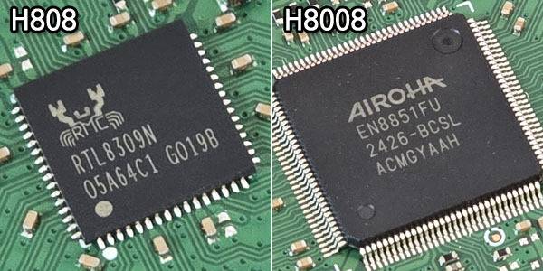 8포트 모델도 마찬가지로 100Mbps 속도의 H808에는 전작과 같은 리얼텍 RTL8309N 칩셋, 중간급 기가비트 모델인 H8008에는 AIROHA EN8851FU 칩셋이 달려있다.