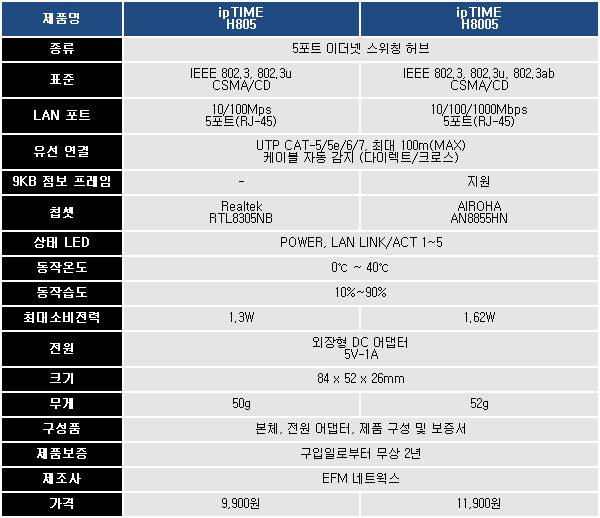 ipTIME H805와 H8005는 동일한 디자인을 하고 있지만 제품 스펙이 다르다. H805는 최대 10/100Mbps 속도를 지원하고, H8005는 10/100/1000Mbps의 기가비트 스위칭 허브이며 9KB 점보 프레임 지원으로 점보 프레임 옵션을 활성화시킨 기가비트 LAN으로 연결된 PC 사이에서 전송 속도를 향상시킬 수 있다.