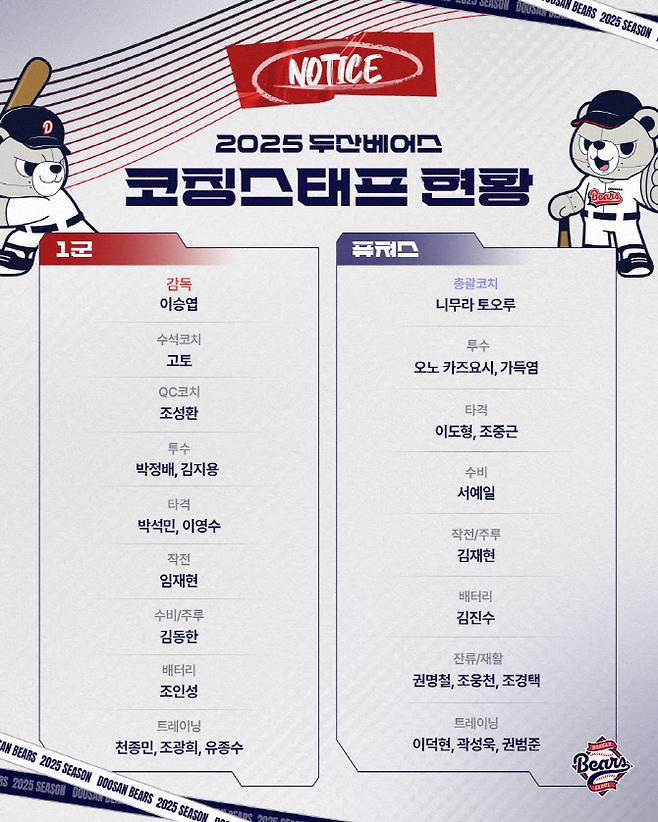 QC 코치의 신설이 가장 눈에 띈다. 두산베어스 구단 측은 “QC 코치는 선수단과 코칭스태프 사이 가교 역할을 담당한다”며 “소통에 능한 조성환 코치를 적임자로 판단했다”고 설명했다.