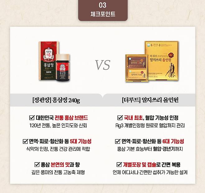 정관장 홍삼정 VS 더루트 알지쓰리 올인원