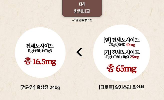 더루트 알지쓰리 올인원은 하루 2포 기준 총 65mg으로, 약 4배 이상 높은 함량을 자랑한다.