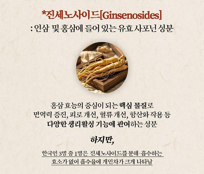나머지 사람들도 체질에 따라 흡수율 차이가 큰 것으로 보고된다. 즉, 진세노사이드가 많이 들어있다고 해서 모두에게 똑같은 효과를 주는 건 아니란 뜻이다.