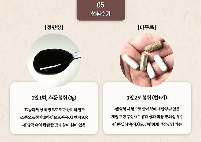 즉, 두 제품 모두 고유의 홍삼 효능을 몸소 느낄 수 있다는 장점은 있지만 복합 기능성과 편의성, 특히 일상에서의 실용성 측면에서는 알지쓰리가 더 실용적인 형태로 느껴졌다.