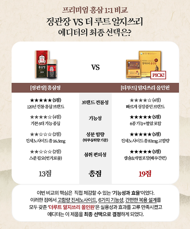 📌 총점 기준으로도 더루트 알지쓰리 올인원이 19점, 정관장 홍삼정의 13점으로 에디터가 직접 복용해 본 결과, 기능성과 실용성의 균형이라는 핵심 가치에서 정관장 홍삼정보다 알지쓰리 올인원 홍삼 제품에서 더 높은 만족도와 홍삼의 효능을 느낄 수 있었다.