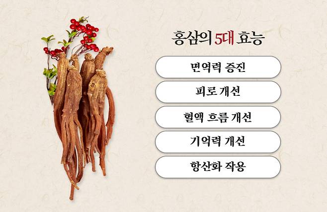 홍삼은 식약처가 기능성을 인정한 건강기능식품이다. 그 핵심은 바로 5가지 홍삼의 효능에 있다.