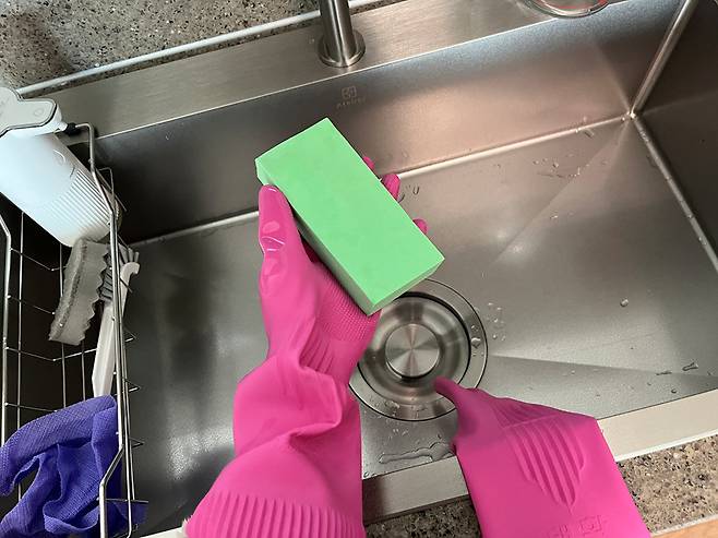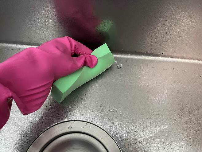 물기제거 스펀지는 다이소 등에서 저렴하게 구매 가능합니다. 물기를 스펀지에 살짝 묻힌 다음 싱크대를 닦아주면 남아 있던 수분을 쫙 빨아들여 물때가 생길 틈을 줄여 줍니다.