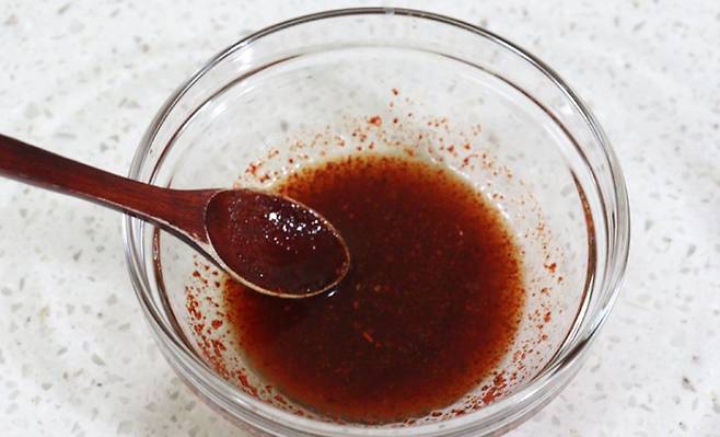 까니리액젓, 설탕, 식초, 고춧가루를 1:1:1:1 비율로 넣습니다.