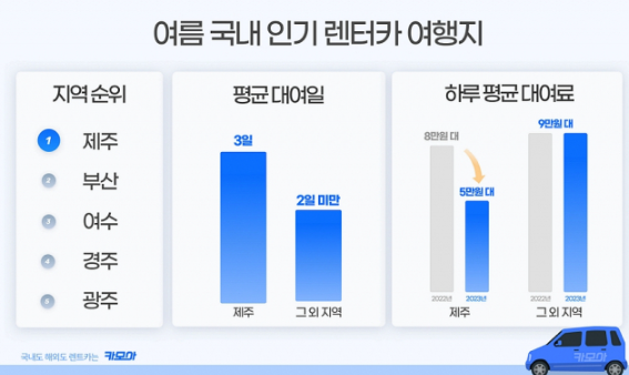 제주는 올 여름 인기 렌터카 여행지 1위로 꼽히고 있는데요. 글로벌 렌터카 플랫폼 카모아가 올해 6~8월 서울을 제외한 지역별 렌터카 예약 현황을 분석한 결과, 제주는 해당 기간 전체 렌터카 예약의 약 82%를 차지했습니다.
