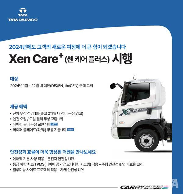 타타대우상용차(사장 김방신)가 준중형트럭 '더쎈(DEXEN)' 구매 고객을 대상으로 차량 유지 보수 및 무상 케어 프로그램 '쎈 케어 플러스(Xen Care+)'를 출시한다고 1일 밝혔다.
