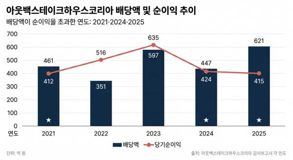 아웃백의 배당 집중도는 단순히 규모의 문제가 아니다. 아웃백스테이크하우스코리아 별도 재무제표를 보면 지난해 당기순이익은 415억원인데 배당으로 내보낸 돈은 621억원이었다. 배당성향이 약 150%에 달하는 셈으로 벌어들인 것보다 50% 더 많은 현금을 모회사에 올려보냈다. 부족분은 쌓아둔 이익잉여금을 소진해 충당했다.