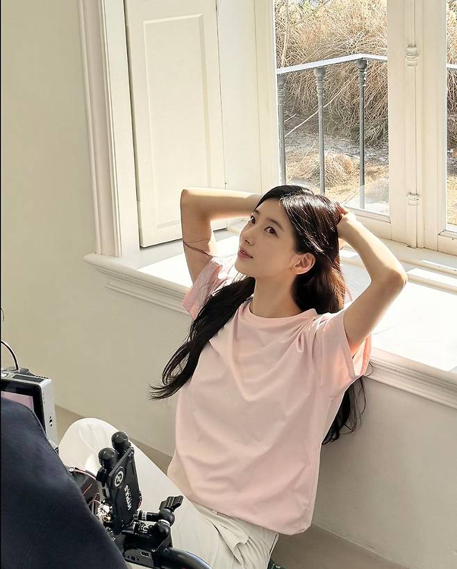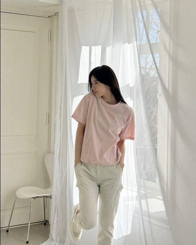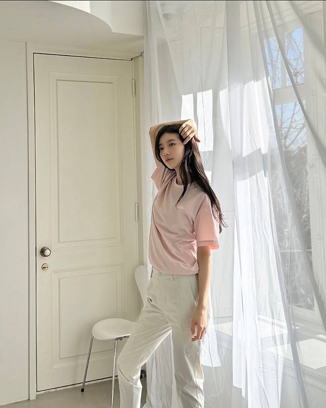 수지는 분홍색 반팔 티셔츠와 함께 화이트 데님 팬츠를 착용해 청순하고 상큼한 이미지를 돋보였습니다.