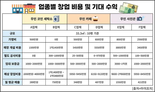무인점포는 표면적으로 ‘직원이 없는 간편한 창업’처럼 보이지만, 업종에 따라 초기 투자금과 수익 구조는 큰 차이를 보인다. 프랜차이즈 업계에 따르면 코인 세탁소, 무인 카페, 무인 사진관 등 무인매장 창업 비용은 업종에 따라 다른데 최소 2000만원에서 최대 1억3152만원대에 달했다.