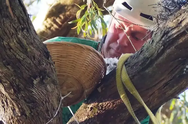 WIRES는 아기새를 둥지로 다시 옮길 준비를 시작하며 지역 수목 재배가에게 전화를 걸었습니다. 그는 거대한 나무 위로 밧줄을 타고 올라갔습니다. 그가 정상에 올랐을 때, 그는 구조된 새의 동생인 또 다른 작은 병아리가 자신을 응시하는 것을 보았습니다. 곧 두 아기새는 한 둥지에 다시 모였습니다.