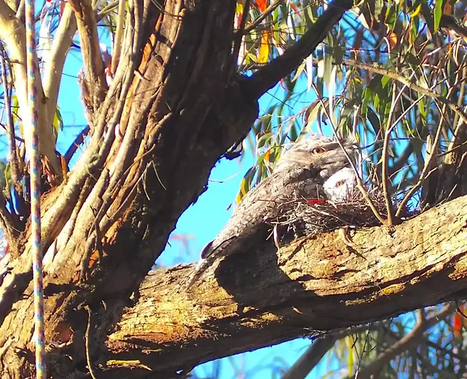 WIRES 담당자는 "황갈색 개구리입 어미새는 아주 기본적인 둥지를 짓습니다. 둥지는 아주 평평하고 보통 나무나 가지 위에 위치합니다."라고 말했습니다. "저희가 둥지가 가장자리에서 넘어졌거나 폭풍우와 강풍으로 날아간 아기새들에 대한 구조 요청을 받는 것은 드문 일이 아닙니다."