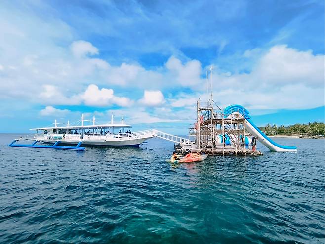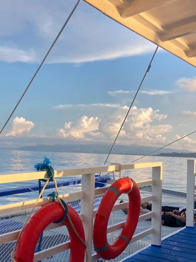 보라카이 호핑투어 중에서 하루 통으로 다녀올 수 있는 곳이라 일정을 계획할 때 참고해줘. 아침 8시까지 선착장에서 만나야해. 보라카이에서 가장 큰 배를 타고 이동하기때문에 안정적이고 쾌적해. 남녀 화장실이 구분되어 있고 실내가 정말 깔끔하고 넓어서 이동하는 동안 편하게 다녀올 수 있어. 옆 그물망이 넓기때문에 이동하는 내내 밖에서 인생샷을 찍기도해.