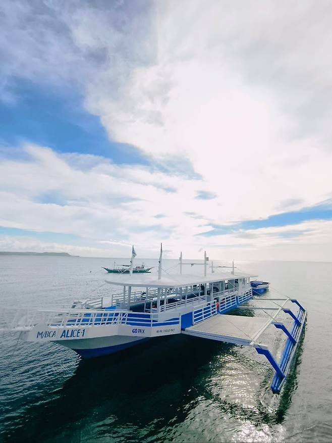 보라카이 호핑투어 중에서 하루 통으로 다녀올 수 있는 곳이라 일정을 계획할 때 참고해줘. 아침 8시까지 선착장에서 만나야해. 보라카이에서 가장 큰 배를 타고 이동하기때문에 안정적이고 쾌적해. 남녀 화장실이 구분되어 있고 실내가 정말 깔끔하고 넓어서 이동하는 동안 편하게 다녀올 수 있어. 옆 그물망이 넓기때문에 이동하는 내내 밖에서 인생샷을 찍기도해.