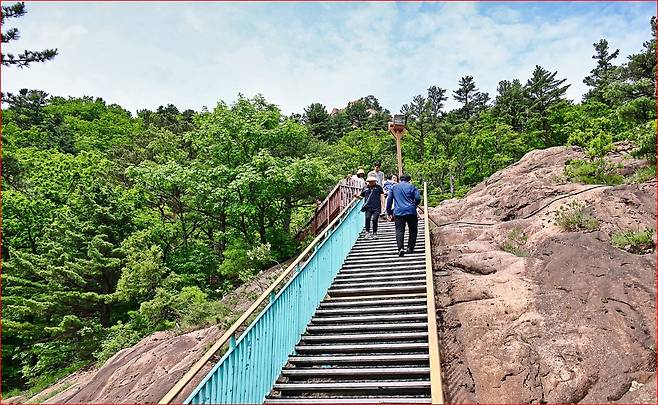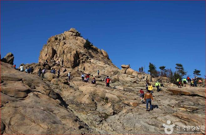 케이블카 하차 후 약 300m 정도만 걸어 올라가면 깎아지른 듯 솟은 거대한 바위산이 모습을 드러냅니다. 그곳에 서면 사방으로 펼쳐지는 풍경이 장관입니다.