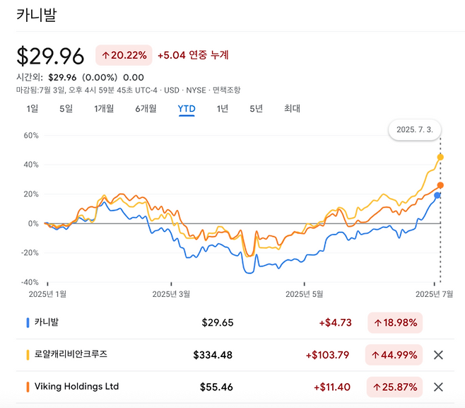3. 다만 경기 변동에 민감한 여행주 특성상 소비 여력이 줄어들 경우 수요 위축 가능성이 있어 거시경제 흐름에 대한 지속적인 관찰이 필요합니다. 실제로 카니발은 1분기 사상 최대 실적을 냈지만 월가 전문가 등이 경제 불확실성을 언급하자 주가가 급락하는 등 외부 변수에 민감한 모습을 보였습니다.