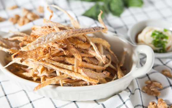 4.팬에 식용유를 두르고 황태채를 중불에서 노릇하게 볶습니다. 겉은 바삭하고 속은 쫄깃하도록 볶는 것이 포인트입니다.