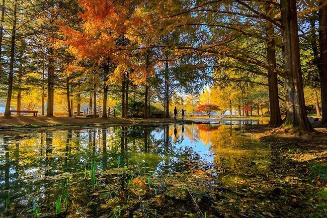 특히 거울숲과 그 위를 가로지르는 외나무다리 포토존이 가장 인기가 많다. 맑은 연못에 단풍과 인물이 데칼코마니처럼 완벽 반영되어 환상적인 사진 한 장을 가져갈 수 있다. 입장료와 주차료 모두 무료로, 경상도 단풍 명소로써 부담 없는 것도 한몫한다.