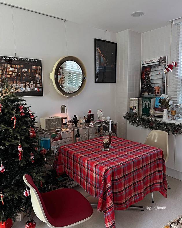 12월에는 지인들과의 모임이나 파티가 잦아지는데, 그에 알맞게 꾸며진 홈파티 존이에요.🍷 레드 컬러로 통일된 체크 디테일의 테이블보와 패브릭 체어가 어우러진 아늑한 다이닝 공간! 옆에는 붉은 오너먼트가 달린 트리까지 조화를 이뤄, 크리스마스 콘셉트에 완벽하게 어울리는 공간이에요. 여기 앉는 순간 집에 갈 생각은 일찌감치 포기해야 할 듯.😅