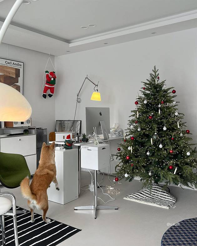 화이트 색상의 무채색 데스크 공간이에요. 큼지막이 놓여 있는 트리와 왼쪽엔 몰래 찾아온(사실 대놓고) 미니 산타의 귀여운 뒷모습이 보이네요. 그 중심을 완성하는 건 노란 컬러의 벽 조명!💡 화이트, 그린, 레드로 차 있는 공간에 은은한 빛이 더해지니 더욱 코지한 무드가 완성됐어요. 예쁜 공간 덕분인지 강아지도 신이 난 것 같네요!🐶
