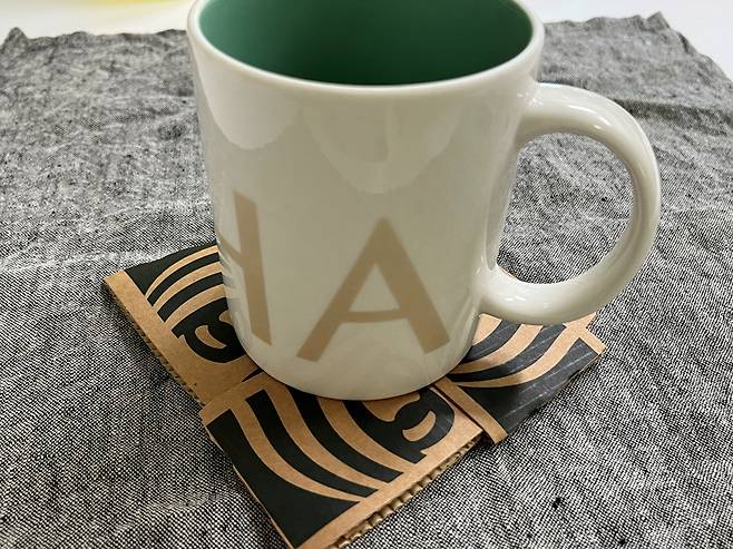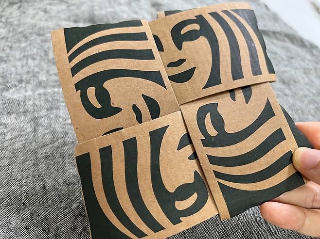 집에서 자주 쓰는 머그컵을 올려보았더니 사이즈가 넉넉한 게 딱입니다. 컵홀더 4개를 겹쳐서 만드니 두께도 두껍고, 여러 번 재활용할 수 있을 듯합니다.