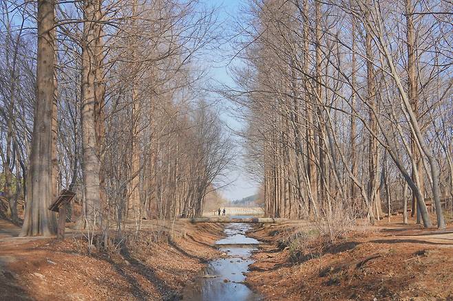 나들이 철에 사람들로 가득 차는 거울 숲의 외나무다리 포토존도 겨울에는 조금 다른 매력을 선보입니다. 하늘을 향해 뻗어있는 메타세쿼이아 나무들이 고요하게 겨울을 맞이하는 모습은 그 자체로 깊은 여운을 남기는데요.