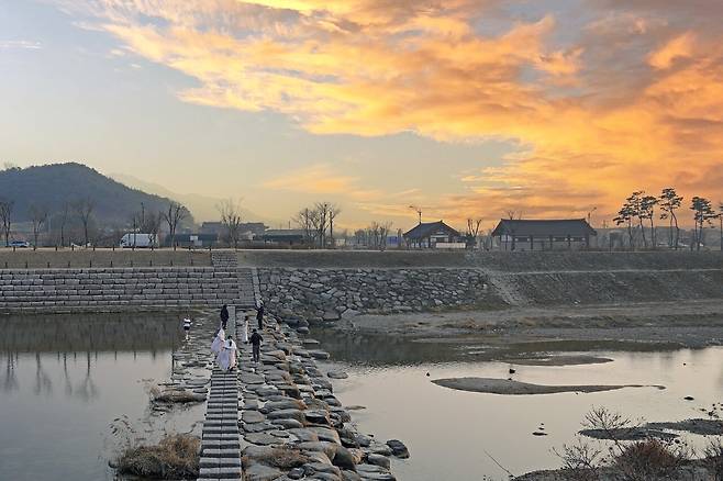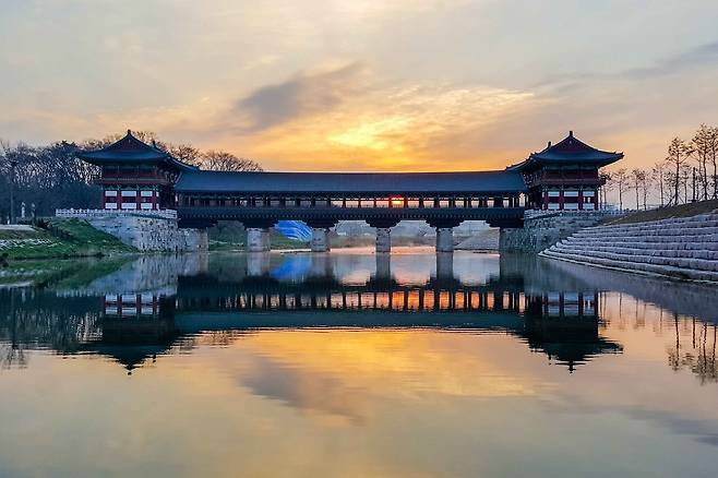 월정교의 가장 매력적인 특징은 물에 비친 모습으로, 마치 완벽한 데칼코마니처럼 위아래로 대칭을 이루는 풍경이 압권이죠. 특히 다리 근처 징검다리에서 바라보면 그 아름다움이 더욱 극대화되는데요. 낮에는 역사적 깊이를, 밤에는 환상적인 야경을 자랑하는 월정교에서 낭만적인 시간을 가져보세요.