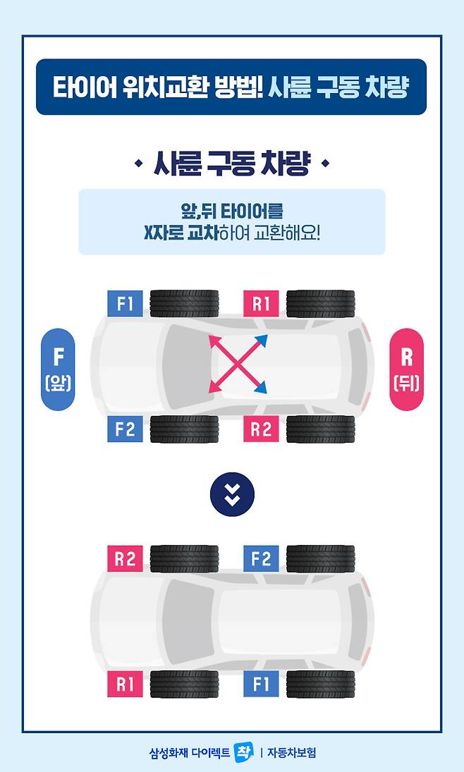 네 바퀴가 모두 엔진의 힘을 받아 달리는 사륜구동 차량은 보통 SUV를 비롯하여 대형 세단, 레저용 자동차 등 고성능 자동차에 보통 채택되는 방식입니다. 사륜구동 방식의 차량의 경우 앞, 뒤 타이어를 X자로 교차하여 교환해주는 것이 좋습니다.