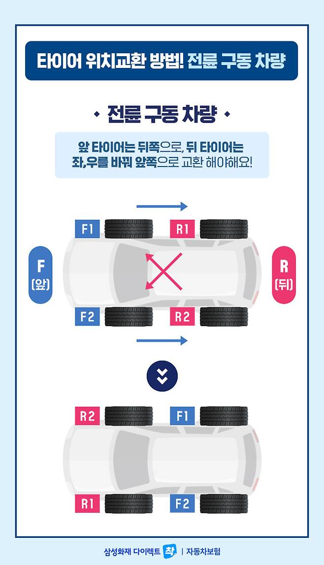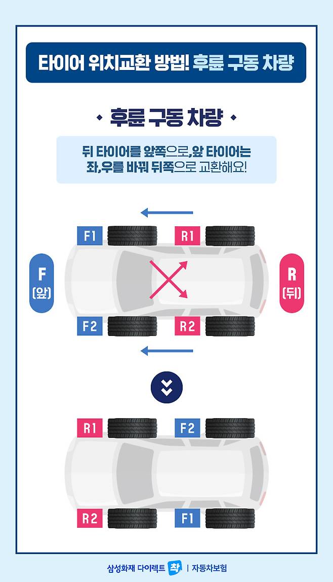보통 수입 자동차에서 많이 보이는 후륜 구동 차량은 뒷바퀴에 힘을 가해 달리는 특징이 있기 때문에 뒤쪽 타이어를 앞쪽으로 앞 타이어는 좌·우를 바꿔 뒤쪽으로 교환하는 것이 좋습니다.