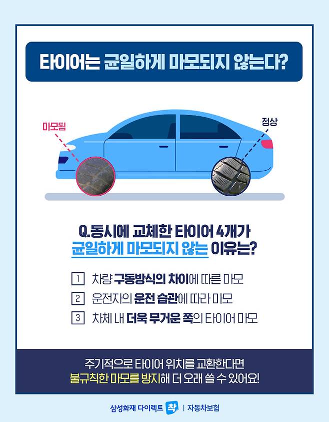 - 차량의 구동 방식에 따라 동력을 전달하여 주행하는 방법이 달라 앞, 뒤 타이어 마모도 차이가 발생할 수 있습니다.