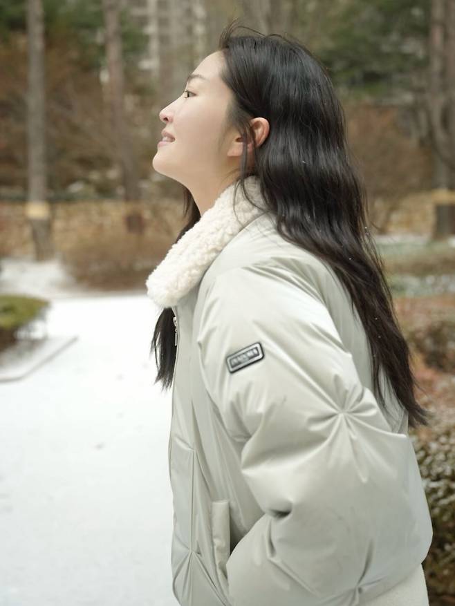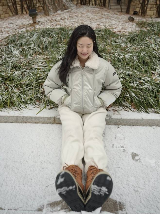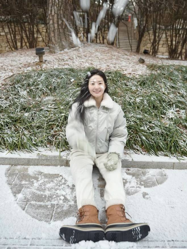 류이서가 하얗게 눈이 내려앉은 교정 한복판에서 아이처럼 해맑은 미소를 짓고 있는 근황을 전했어요.