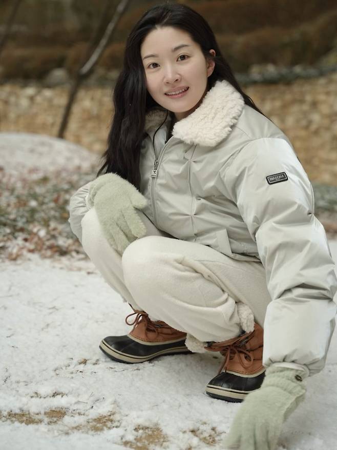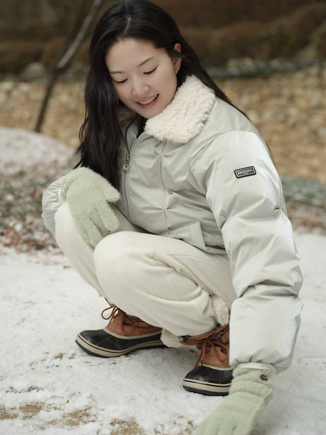 하얀 눈과 대비되는 따뜻한 브라운 컬러의 털부츠를 신어 귀여운 포인트를 주었고, 주머니에 손을 쏙 넣은 채 수줍게 웃는 포즈가 그녀만의 사랑스러운 매력을 극대화해주고 있거든요.