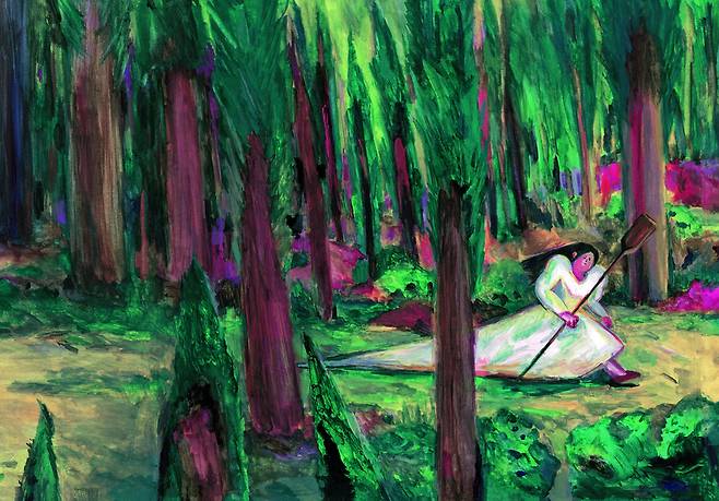 짙은 숲이 화면을 가득 메운다. 짙은 초록과 어두운 갈색이 겹겹이 쌓여 길을 좀처럼 내주지 않는다. 거친 붓질의 나무들은 빛을 삼킨 벽처럼 서 있다. 그 사이로 얼룩진 흰 드레스의 소녀가 지나간다. 손에는 숲과 어울리지 않는 노 하나가 들려 있다.