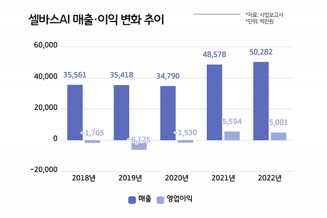 셀바스AI의 실적 상황이 개선된 건 2021년 말부터다. 앞서 2~3년의 시간은 일종의 '보릿고개'였다. 2016년 바둑 AI 분야의 '알파고 쇼크' 이후 국내외에서 AI 기업들이 우후죽순 생겨났지만 비전만 있고 수익성은 높지 않았던 시기가 상당 기간 이어졌다. 시장 내 기술이 고도화되고 실제 수요를 만드는 서비스들이 만들어진 건 몇 년이 지나서다. 셀바스AI도 2018년~2020년은 연매출 350억원 규모에 15억~60억원 수준의 영업손실을 견뎌야 했던 시기다.