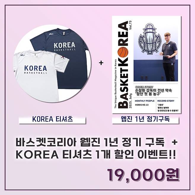 그리고 바스켓코리아 웹진 2025년 7월호와 관련된 프로모션 이벤트도 진행 중이다. 바스켓코리아 웹진 2025년 7월호와 BROSPO에서 제작한 KOREA 티셔츠 1개를 19,000원에 구매할 수 있고, 바스켓코리아 웹진 2025년 7월호만 구매한 이들은 9,000원의 금액으로 더블쿠션 스포츠 양말 4켤레를 받을 수 있다.