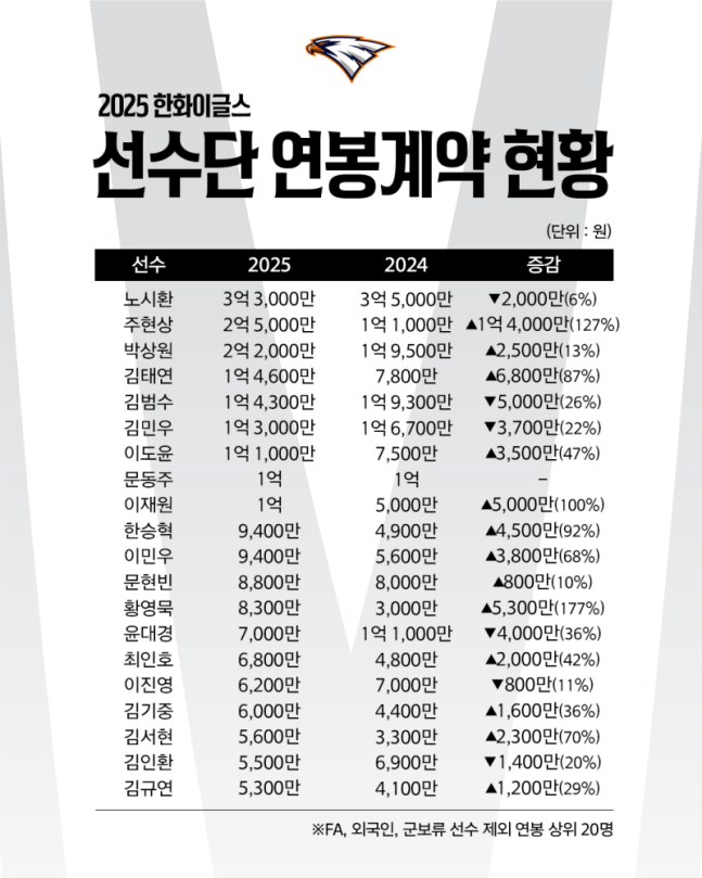 한화 이글스는 21일 "2025년 재계약자 59명 대상 연봉협상을 완료했다"고 공식 발표했다.