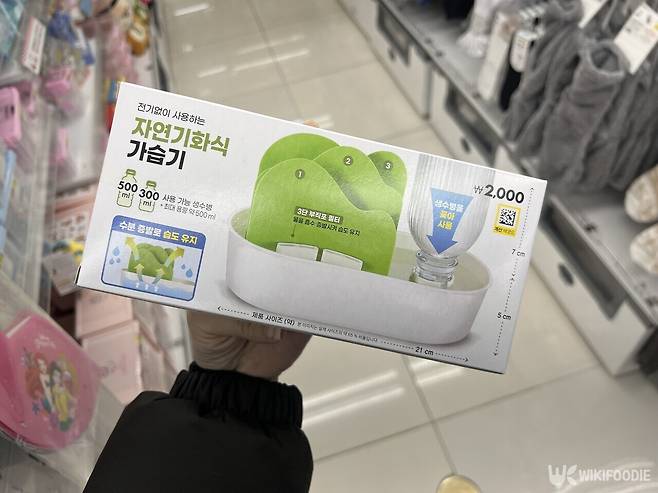 가격은 3000원이다. 사용 방법은 생수병을 거꾸로 꽂는 구조다. 물을 채운 생수병을 본체 홈에 끼우면 필터가 물을 흡수하고, 시간이 지나며 수분이 공기 중으로 퍼진다. 생수병은 구성품에 포함되지 않아 집에 있는 일회용 병을 그대로 쓰면 된다.