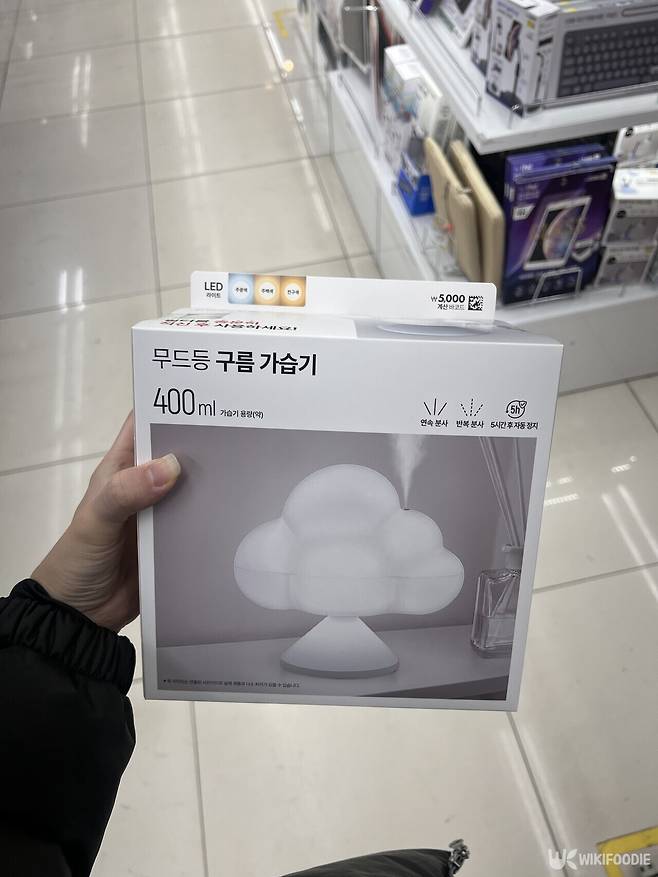 먼저 눈에 띄는 제품은 무드등 구름 가습기다. 다이소 코너에서 조명 소품처럼 진열돼 있어 지나가다 한 번 더 보게 되는 제품이다. 둥근 외형에 흰색 계열 디자인으로, 전원을 끄면 가습기보다 조명 소품에 가깝게 보인다. 책상 한쪽에 올려두면 공간을 해치지 않고 자연스럽게 어울린다.