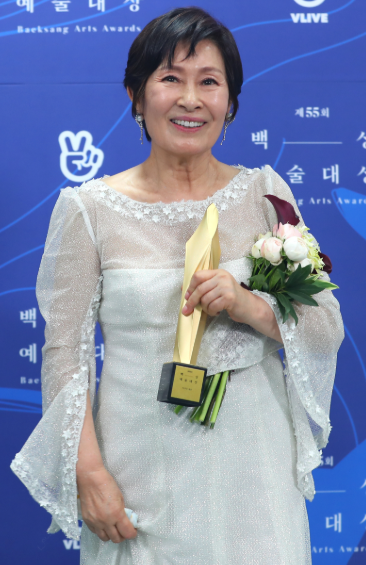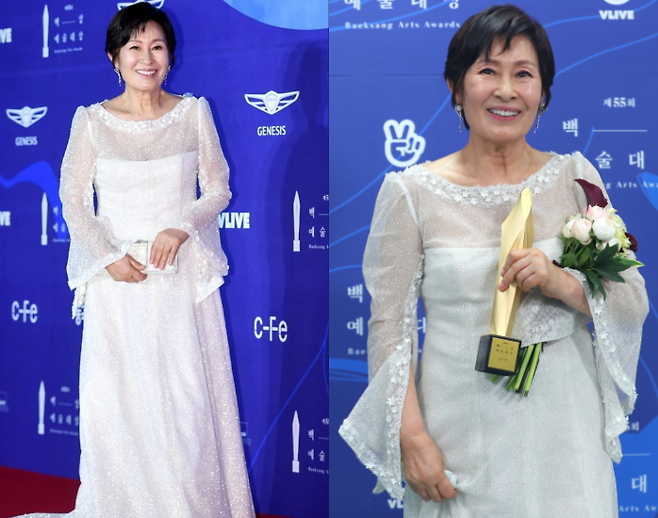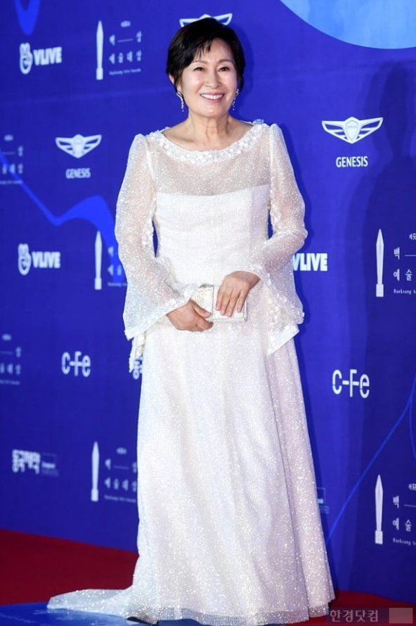 김혜자는 화이트 드레스룩을 입고 우아한 자태를 뽐냈다. 시스루 디테일이 들어간 소매와 자수 장식이 그녀의 우아함을 더욱 배가시켰다. 귀에는 실버 귀걸이를 착용해 세련된 분위기를 더했고, 그녀의 모습은 성숙함과 우아함을 완벽하게 조화시켰다.