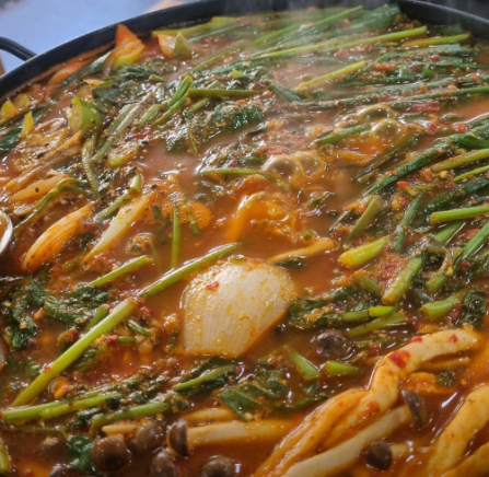 ▶ 생선 없이도 시원하고 깊은 국물 맛!▶ 쑥갓과 깻잎의 조합이 매운탕의 매운맛을 중화하며 향긋함을 더함
