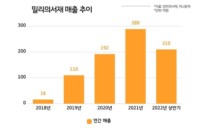 밀리의서재 매출은 해마다 꾸준히 증가하긴 했습니다. 2018년 16억원에 불과했던 밀리의서재의 연 매출은 1년 만인 2019년 110억원대로 성장했고요. 2020년에는 192억원의 매출을 올렸어요. 2021년 매출액은 289억원이었고요.