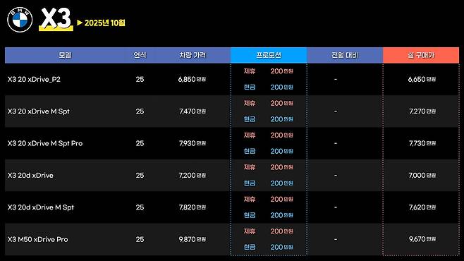 2025년 10월 기준 BMW X3의 프로모션 할인 폭이 엄청나다. X3 20 xDrive 기본 모델의 경우 출고가 6,850만원에서 실구매가 6,700만원으로 150만원의 직접 할인이 적용된다. M Sport 트림은 더욱 파격적이다. 7,470만원 출고가에서 최대 550만원까지 할인받을 수 있어 실구매가가 6,920만원 선까지 떨어진다.
