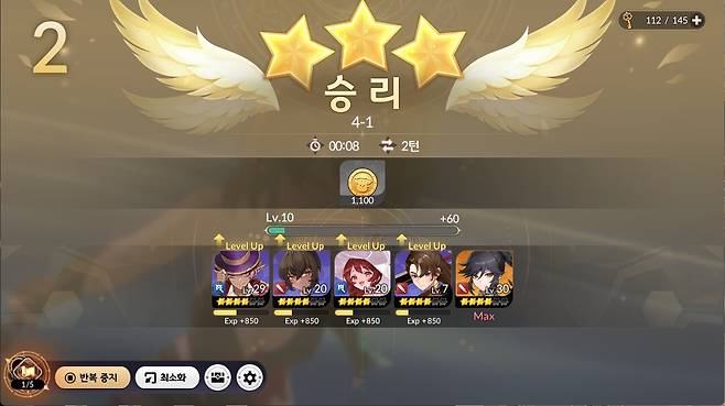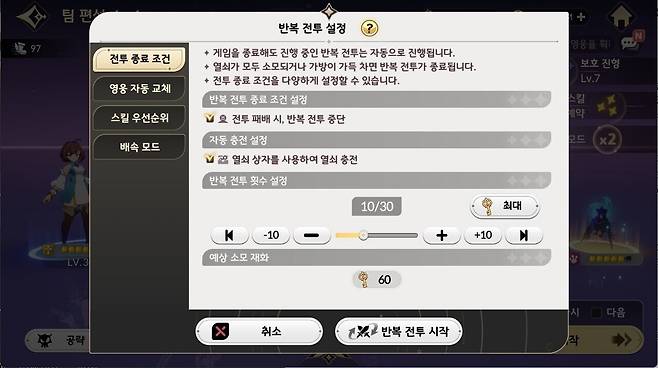 최대 횟수는 30회까지 '반복 전투 설정'은 총 네 가지 항목으로 구성되어 있다. 먼저, '전투 종료 조건'에선 반복 전투 횟수를 설정할 수 있다. 반복 전투 횟수는 최대 30회까지 설정할 수 있으며, 최대 횟수로 설정 시 180개의 열쇠가 필요하다. 보유하고 있는 열쇠가 부족할 경우, 열쇠 상자를 자동으로 사용해 열쇠를 충전하며 설정한 횟수까지 반복 전투가 진행된다.