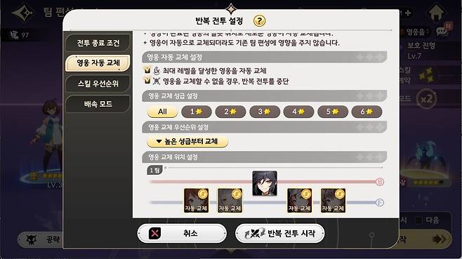 다음으로 '영웅 자동 교체'는 팀에 포함된 영웅이 30레벨을 달성할 경우, 자동으로 다른 영웅으로 교체해주는 항목이다. 쫄작은 성급에 관계 없이 레벨이 낮은 영웅을 30레벨까지 키우는 것이 목표인 만큼, 모든 항목에 체크해주는 것이 좋다. 이외에 '스킬 우선순위' 및 '배속 모드' 역시 모두 체크하자.